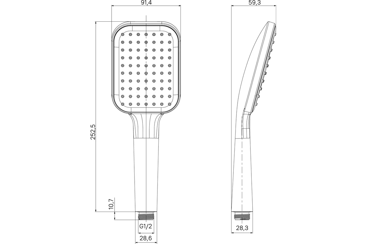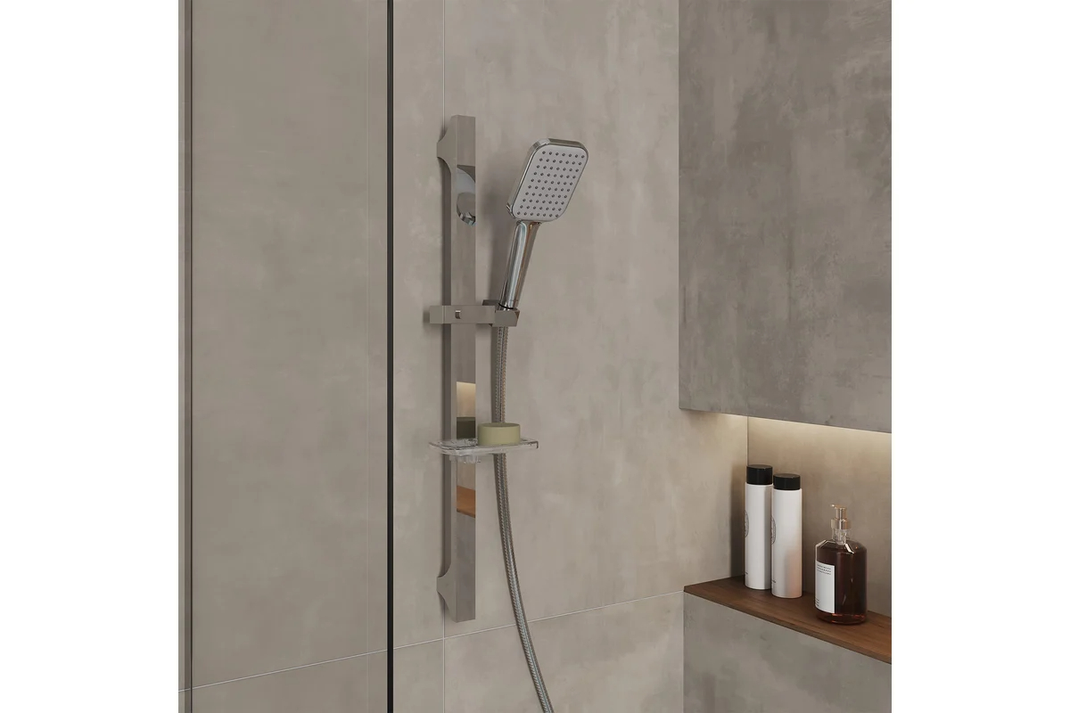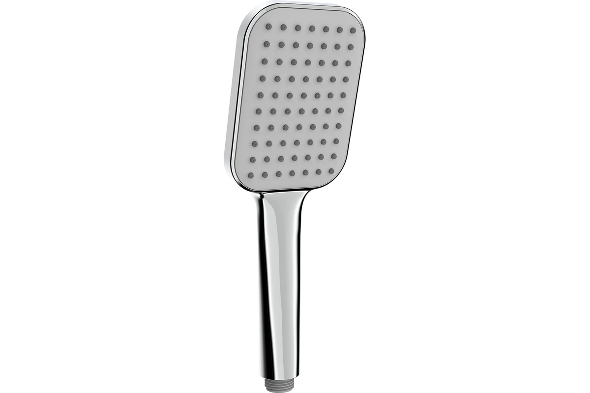 Ручная лейка для душа, ABS-пластик, 1 режим, глянцевый хром, серое лицо, серые форсунки, материал форсунок ТРR. Размер лица лейки 90х110 мм.