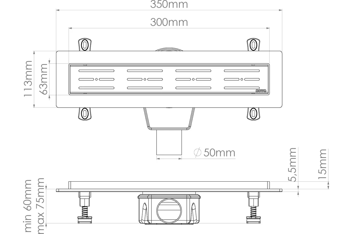 Лоток душевой 300 мм. Nova (боковой слив 360° D50, сухой затвор, решетка из нерж.ст / полоска горизонтальная) (5630)