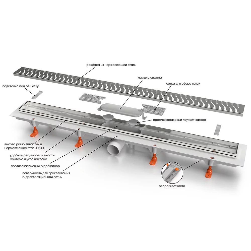 В комплекте: самоклеящаяся гидроизоляционная пленка, регулируемые ножки, комплект креплений, пластиковый ключ для снятия нержавеющей решетки и инструкция по установке.