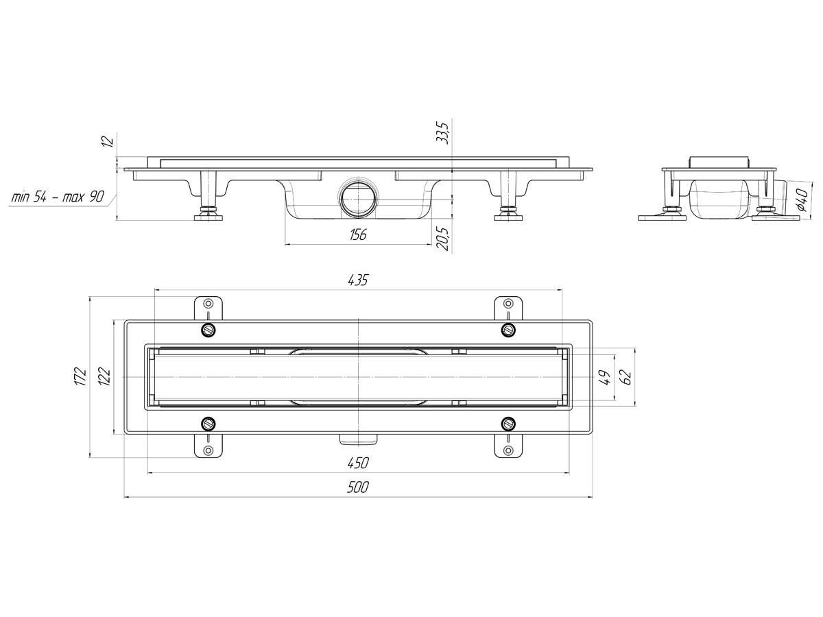 Линейный трап лоток для душа с сухим затвором – классическое техническое решение для отвода воды из ванной комнаты. Имеет вытянутую прямоугольную форму, его также называют дренажным каналом или душевым лотком. Сверху конструкция трапа закрывается декоративной решеткой из нержавеющей стали. Трап с сухим затвором - идеальное решение при нерегулярном водоотведении и использовании теплого пола. Трап устанавливается в пол, общую высоту монтажа можно регулировать от 66 до 102 мм. Трап изготовлен из прочного АБС-пластика, устойчивого к высоким температурам, ударным нагрузкам и воздействию влаги. Отличается надежностью конструкции и продолжительным сроком эксплуатации. Устанавливается по краям или в углах душевой комнаты и фиксируется с помощью крепежных элементов. Внутри корпуса установлен съемный сифон (гидрозатвор) и съемный клапан сухого затвора. Слив горизонтальный, диаметр выпуска 40 мм. Пропускная способность — 45 л/мин. Сверху трап закрывает прямоугольная гладкая матовая решетка (нержавеющая сталь), которая задерживает мусор, препятствуя забиванию слива, а также выполняет декоративную функцию. На решетку можно становиться, принимая душ: изделие выдерживает нагрузку до 300 кг.