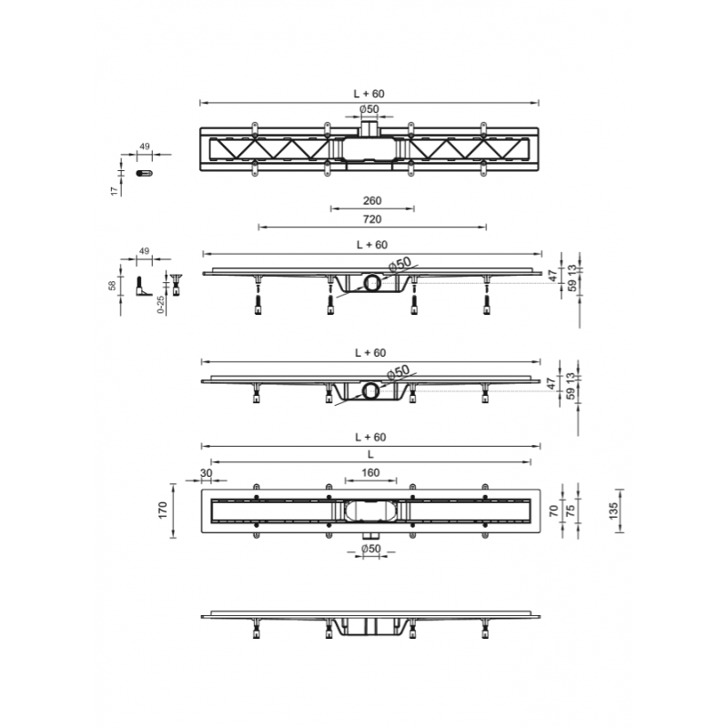 Лотки изготавливаются в размерах 400-100см, что даёт возможность выбрать приемлемый для конкретной душевой вариант размера и типа решетки.