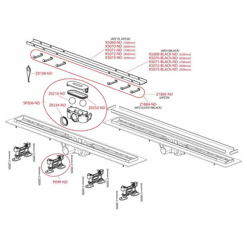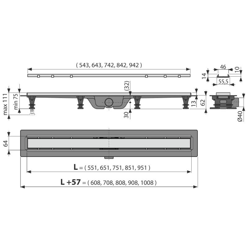 Общая монтажная длина водоотводящего желоба APZ20-550 - 607 мм, длина поверхности для решетки - 550 мм, ширина - 64 мм, высота монтажа желоба 75-111 мм, выход в канализацию горизонтальный 40 мм. Сифон с комбинированным гидрозатвором SMART, скорость стока воды 24 л/мин.