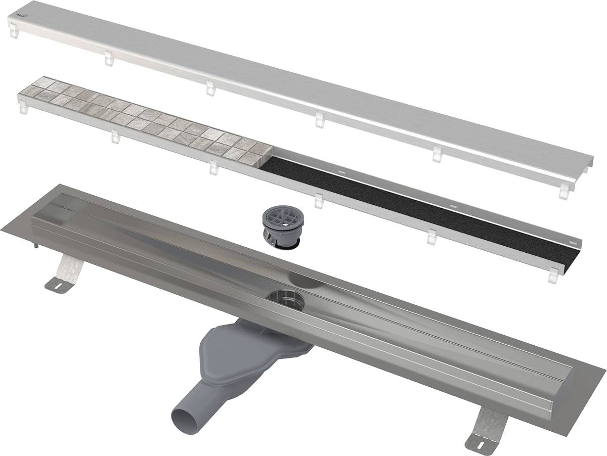 В комплект желоба входит всё необходимое для проведения монтажа ""под ключ"". Особенностью комплектации водоотводящего желоба APZ13-DOUBLE6 является двухсторонняя решетка: с одной стороны сплошная металлическая поверхность, с другой - решетка под кладку плитки.