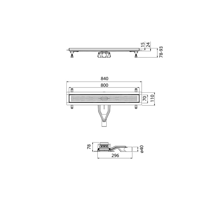 Лоток душевой, сифон 360, комбинированный затвор, перфорированная решетка, 800мм, черный. Корпус и решетки выполнены из нержавеющей стали 304.