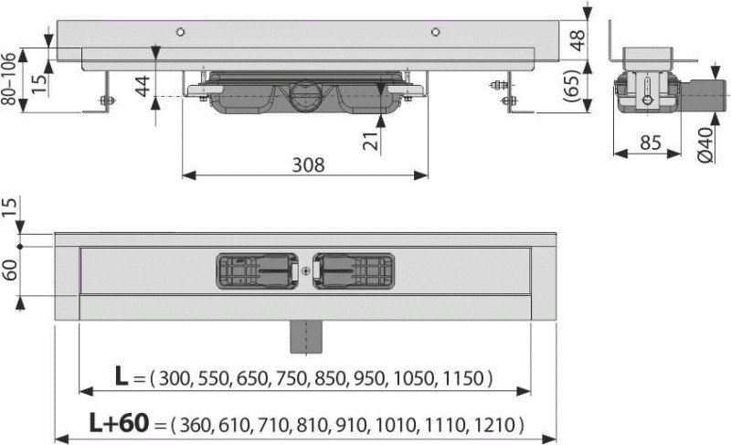 а также для решетки под кладку плитки и призматической решетки. Высота монтажа от 65 мм. Регулируемый по высоте. Сифон прочно соединяется с желобом – 100% водонепроницаемость. Самоклеящиеся ленты для качественной гидроизоляции. Вручную легко чистящийся сифон