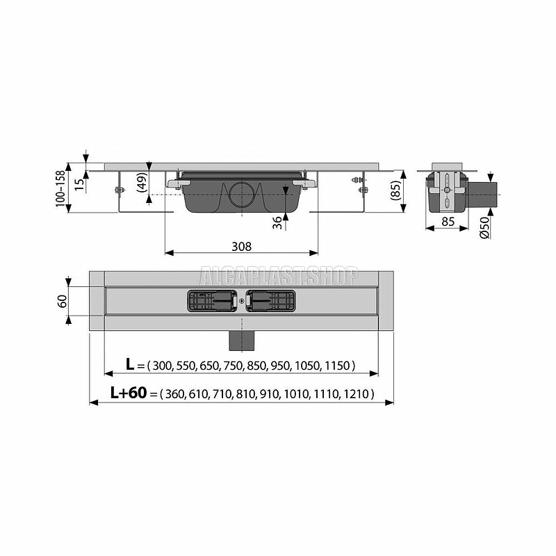 Лоток душевой AlcaPlast с порогами для перфор. решетки с горизонтальным стоком Alcadrain (APZ1S-300)