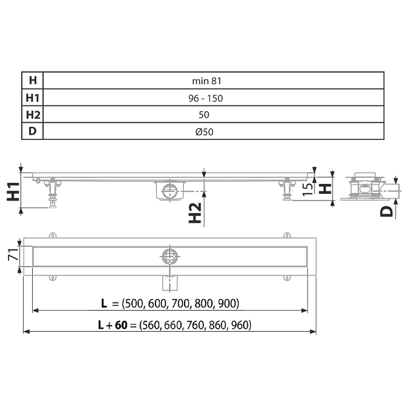 Лоток душевой Timo горизонтальный DP20 660x119xDN50 без решетки, нерж.ст. (DP20-600)