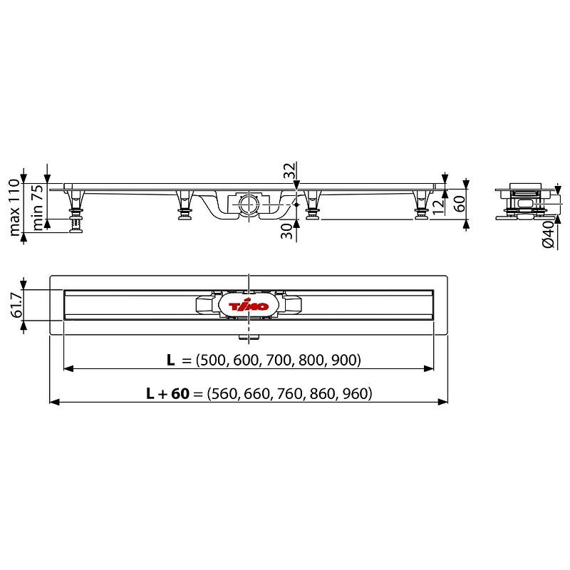 Лоток душевой Timo горизонтальный SP10 960x110xDN40 без решетки, ABS, пороги из нерж.ст. (SP10-900)