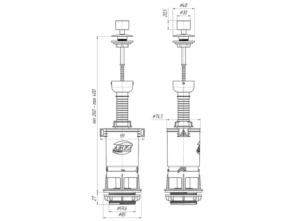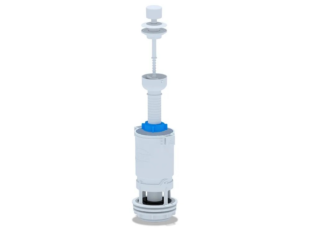 Сливной механизм белая пластиковая ручка со штоковым режимом слива, регулировка по высоте 260-400 мм. Отверстие под ручку слива в крышке бачка от 25 до 40 мм, посадочное отверстие сливной арматуры 60 мм.