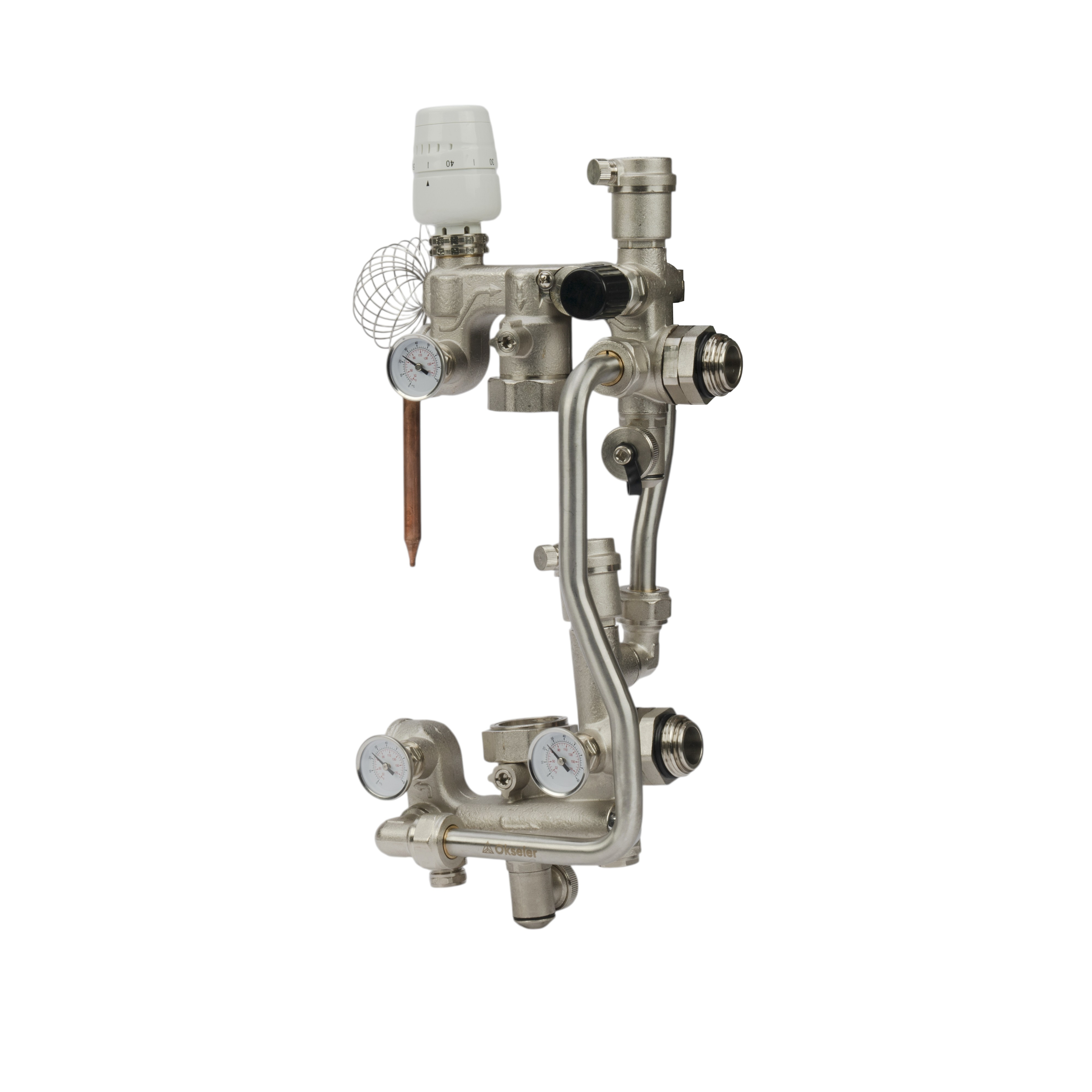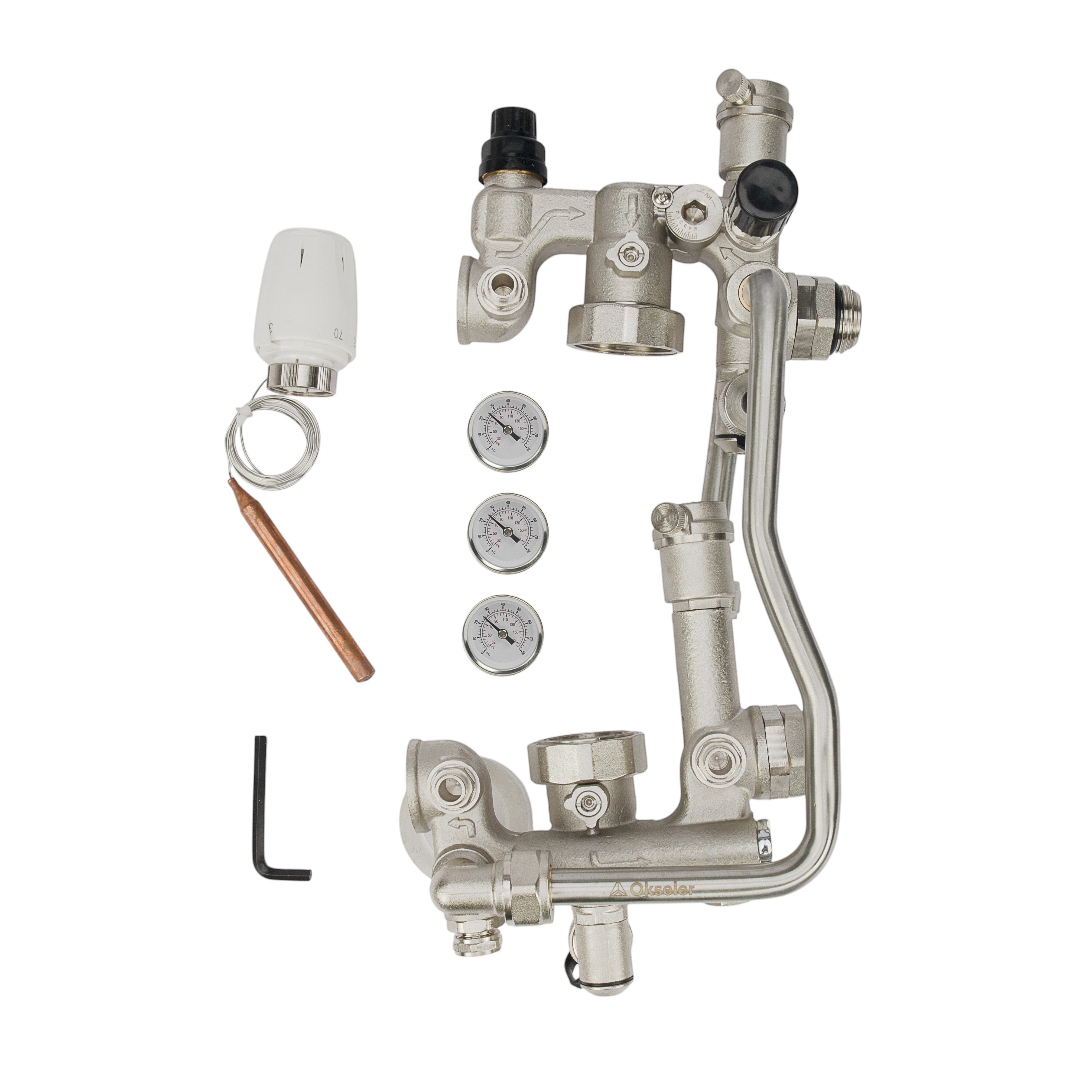 Модуль подмешивающий Okseler с термостатом 20-60°С, байпасом и перепускным клапаном, без насоса 180 мм (Oks00737)