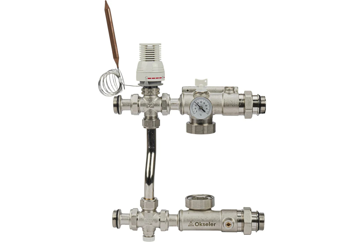 Модуль подмешивающий Okseler с термостатом 20-60°С, с перепускным клапаном, без насоса 130 мм (Oks00738)
