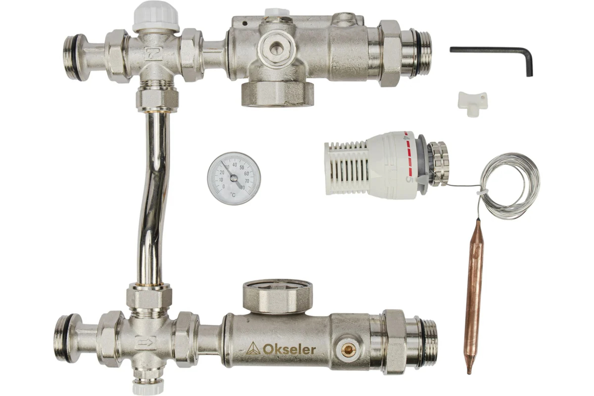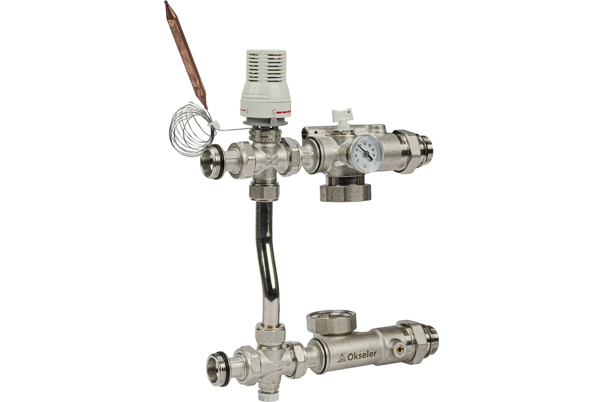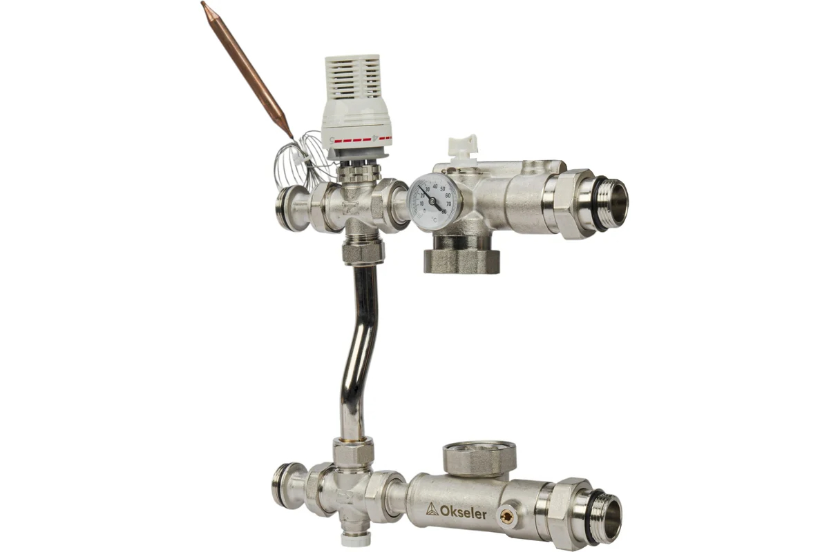 Блок насосно-смесительный Okseler с термостатом 20-60°С, с перепускным клапаном без насоса 130 мм представляет собой готовый комплект арматуры в сборе, предназначенный для создания циркуляционного контура с обеспечением поддержания заданной температуры путем смешивания подающей и обратной линии. Циркуляционный насос не входит в комплектацию блока и заказывается отдельно. Монтажная длина устанавливаемого насоса должна составлять 130 мм, патрубки присоединения насоса – G 1 1/2 ""
