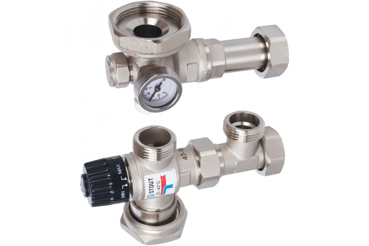 Насосно-смесительный узел с 4-х ходовым термостатическим клапаном STOUT изделие полной заводской готовности. Предназначен для обеспечения циркуляции и поддержания температуры подающего теплоносителя в пределах 30-60°С в системах отопления типа «теплый пол».