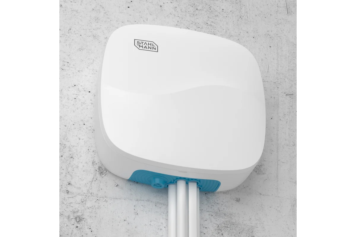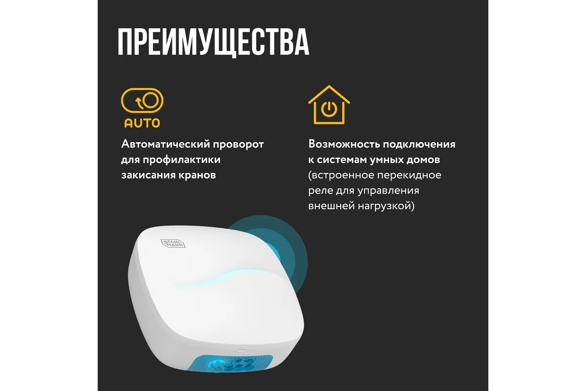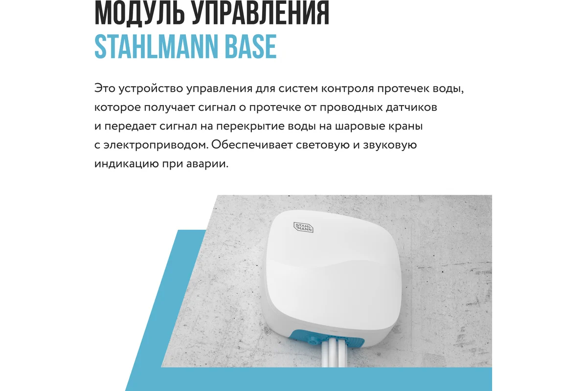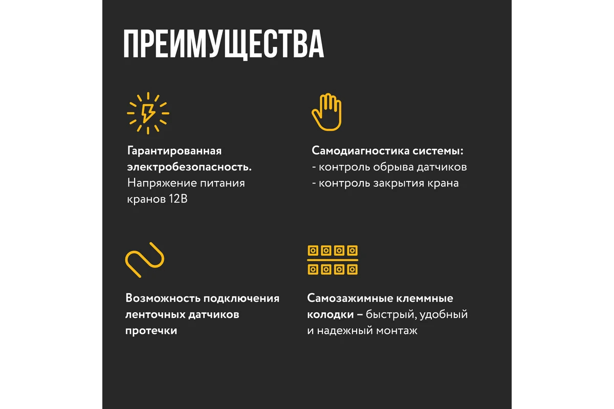 Модуль получает сигнал о протечке от проводных датчиков и передает сигнал на перекрытие воды на шаровые краны с электроприводом.