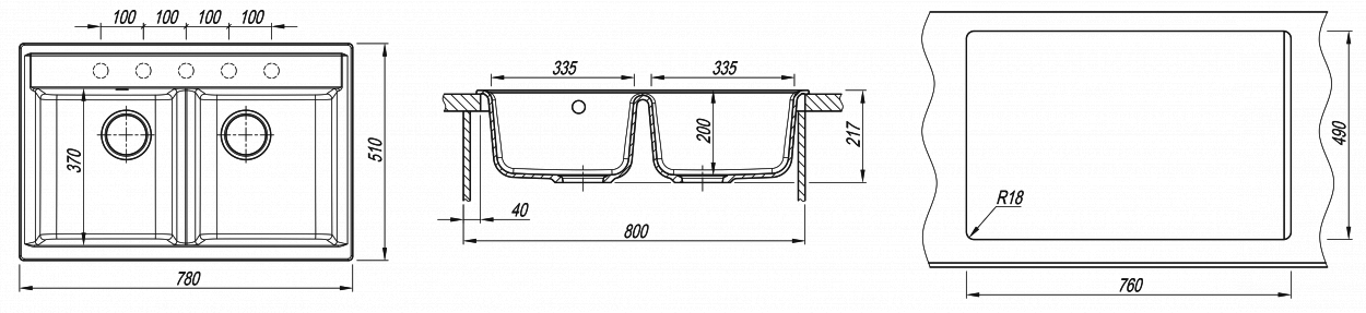 Отверстия под смеситель - без отверстия под смеситель, имеет 2 намеченных отверстия под смеситель.