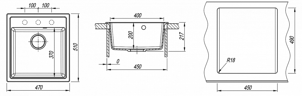 Отверстия под смеситель - без отверстия под смеситель, имеет 3 намеченных отверстия под смеситель.