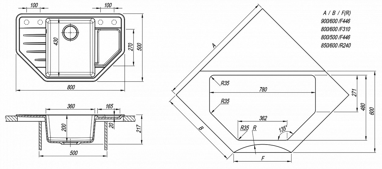 Состав поставки: мойка, отводная арматура с выпуском 3 1/2 (D=90 мм) и переливом.