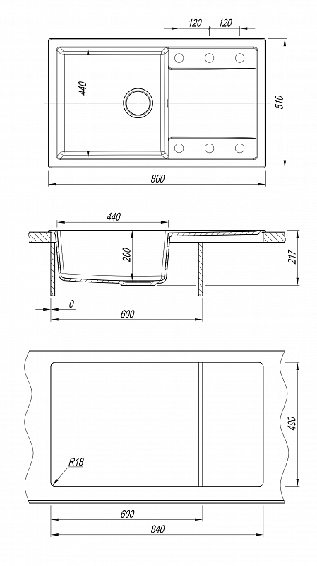 Мойка доступна в различных цветах: белый, дюна, латте, серый, терра, терракота, чёрный.Отверстия под смеситель - без отверстия под смеситель, имеет 3 намеченных отверстия под смеситель.Состав поставки: мойка, отводная арматура с выпуском 3 ? ” (D=90 мм) и переливом.
