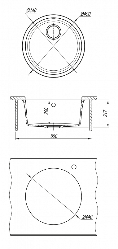 Мойка для монтажа под столешницу с круглой чашей в блок 60 см.