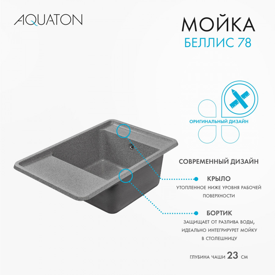 Новая серия кухонных моек из литого мрамора AQUATON БЕЛЛИС: урбанистический характер и максимальная функциональность. Современная кухня должна отвечать самым высоким требованиям: быть практичной, долговечной, безопасной и максимально функциональной, чтобы каждый день в заботе о близких вы ощущали преимущества инновационных технологий. AQUATON представляет новую коллекцию кухонных моек БЕЛЛИС из литого мрамора с ультрамодным урбанистическим дизайном, который идеально дополнит вашу кухню. Уникальный дизайн, навеянный новыми трендами Запада, делает новую серию кухонных моек Беллис не только безупречно красивой, но и очень функциональной. Увеличенная глубина чаши, утопленное ниже уровня рабочей поверхности крыло и защищающий от разлива воды бортик идеально интегрируют мойку в столешницу, создавая ощущение единого целого. Серия представлена в четырёх популярных размерах - 57, 78, 87 и 97 см. На выбор 9 цветовых решений, которые подчеркнут ваш индивидуальный стиль и преобразят интерьер: графит, песочный, серый, жемчуг, серый шёлк, латте, терракот, кофе и шампань. Модели разработаны с увеличенной глубиной чаши и дополнены новым аксессуаром - разделочной доской из дуба, которая сделает мойку еще более функциональной и позволит увеличить размер рабочей поверхности, обеспечивая устойчивую износостойкую основу для резки. Практичный и простой в уходе дуб — натуральный материал, который сделает вашу кухню ярче и уютнее! Благодаря идеально гладкой поверхности и отсутствию микропор кухонные мойки AQUATON БЕЛЛИС невероятно приятны на ощупь и имеют высокие антибактериальные свойства, за ними легко ухаживать. Изделия серии обладают длительным сроком службы: гарантия на мойки составляет 5 лет, а срок эксплуатации не менее 10 лет!