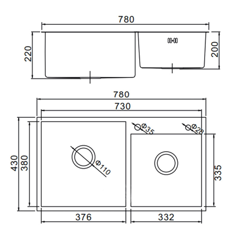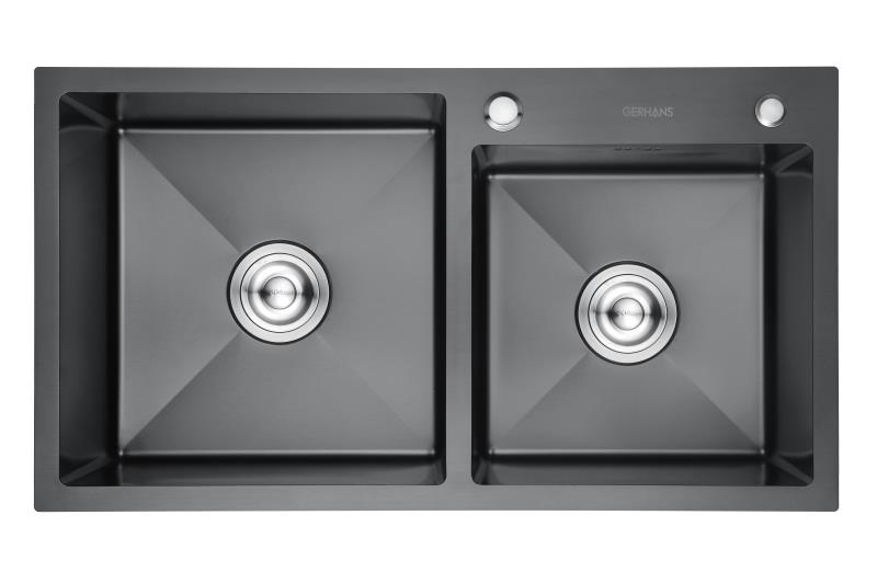 Двойная мойка для кухни из нержавеющей стали Gerhans K37843- предназначена для размещения в отверстие кухонной столешницы и имеет размеры 780*430 мм, глубина мойки 220 мм. Изготовлена из нержавеющей стали марки SUS304 с графитовым PVD покрытием (напыление в вакууме), диаметр сливных отверстий 110 мм, конструкция прямоугольной формы с двумя чашами с переливом, на поверхности есть отверстие для смесителя и под кран питьевой воды. Сифон для мойки идет в комплекте.