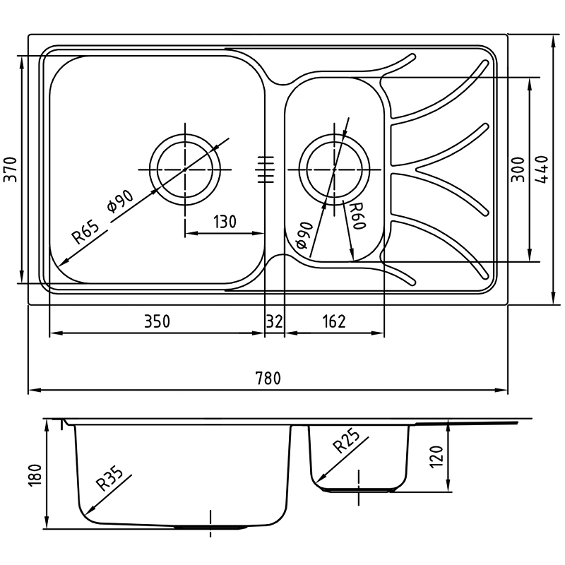Мойка из нержавеющей стали размером 780*440*180 (мм), прямоугольной формы с крылом, 1 1/2 чаши, поверхность сатин, с резиновой накладкой и антишумовым покрытием, в комплекте с креплением и уплотнительной лентой.