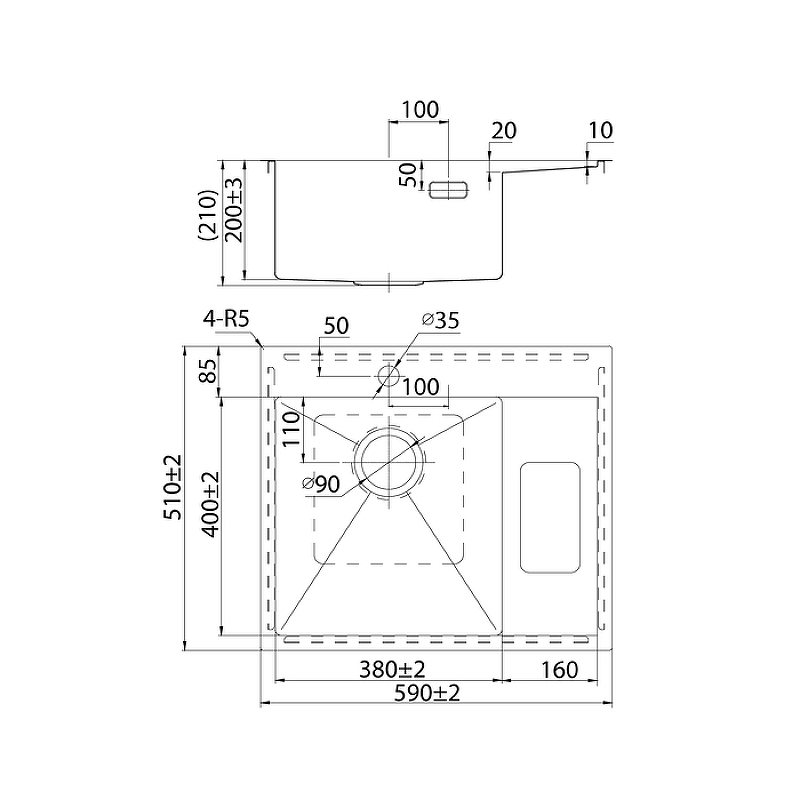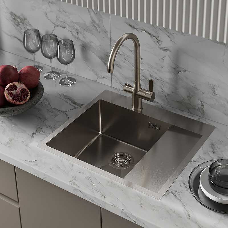 Мойка стальная с крылом, чаша слева, цвет - сатин, размер: 590x510x200, размер чаши 380х400, комплектация: выпуск с переливом, плоский сифон, крепеж, шаблон для выреза. Материал - 304 нерж. сталь, толщина стали 1,2 мм, резиновые накладки (боковины+дно) и антишумовое покрытие по всей поверхности мойки.