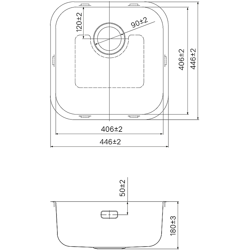 Мойка из нержавеющая стали SS 304, универсального монтажа, размер 446*446*180, размер чаши 406*406мм., без отверстия под смеситель, антишумовое покрытие Silenon, антишумовая накладка, поверхность сатин. В комплекте 2 набора крепежа: для врезного и для подстольного монтажа. Сливная арматура: выпуск с переливом и лазерным логотипом, сифон. Упаковка: картонный рукав, полиэтиленовый пакет.