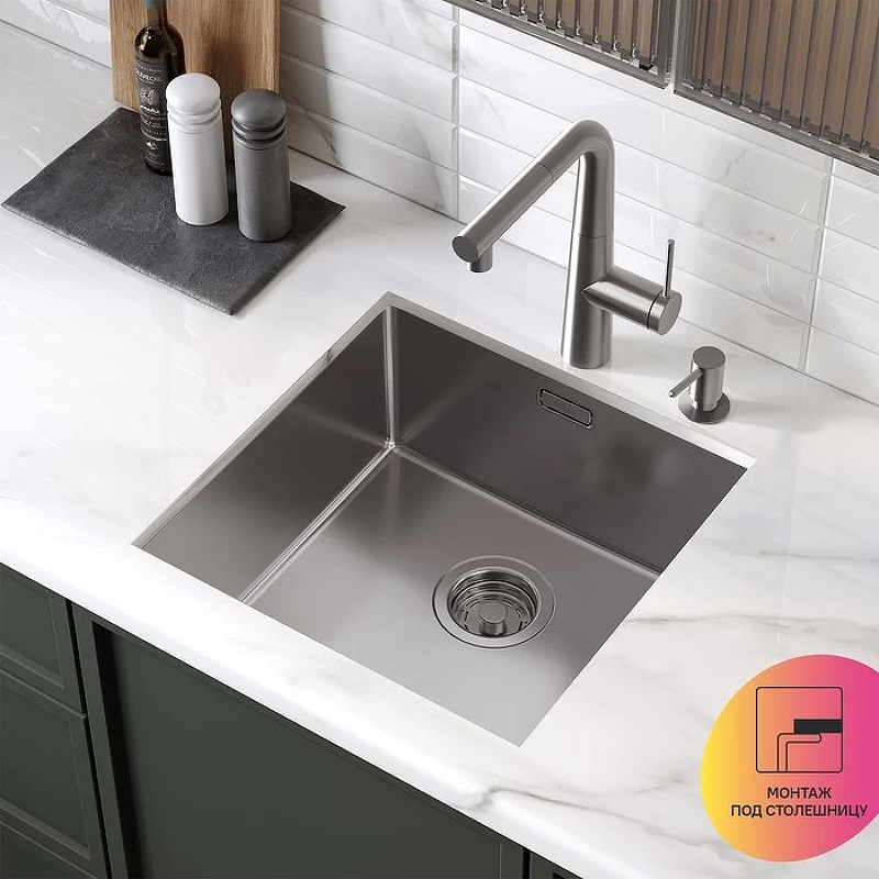 Мойка из нержавеющая стали SS 304 универсального монтажа, размер 440*440*200 мм, размер чаши 400*400 мм, толщина 1 мм, без отверстия под смеситель, антишумовое покрытие Silenon, антишумовая накладка, поверхность сатин. В комплекте 2 набора крепежа: для врезного и для подстольного монтажа. Сливная арматура: выпуск с переливом и лазерным логотипом, сифон. Упаковка: индивидуальная коробка