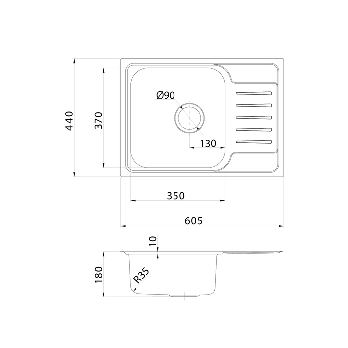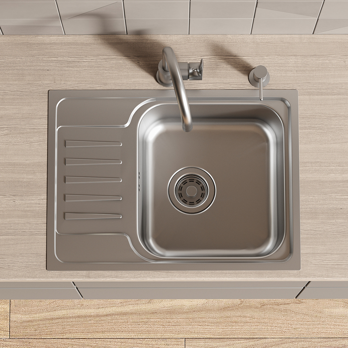 Мойка из нержавеющей стали размером 605X440*180 (мм) прямоугольной формы с крылом, поверхность сатин, с резиновой накладкой и антишумовым покрытием, в комплекте с креплением и уплотнительной лентой.