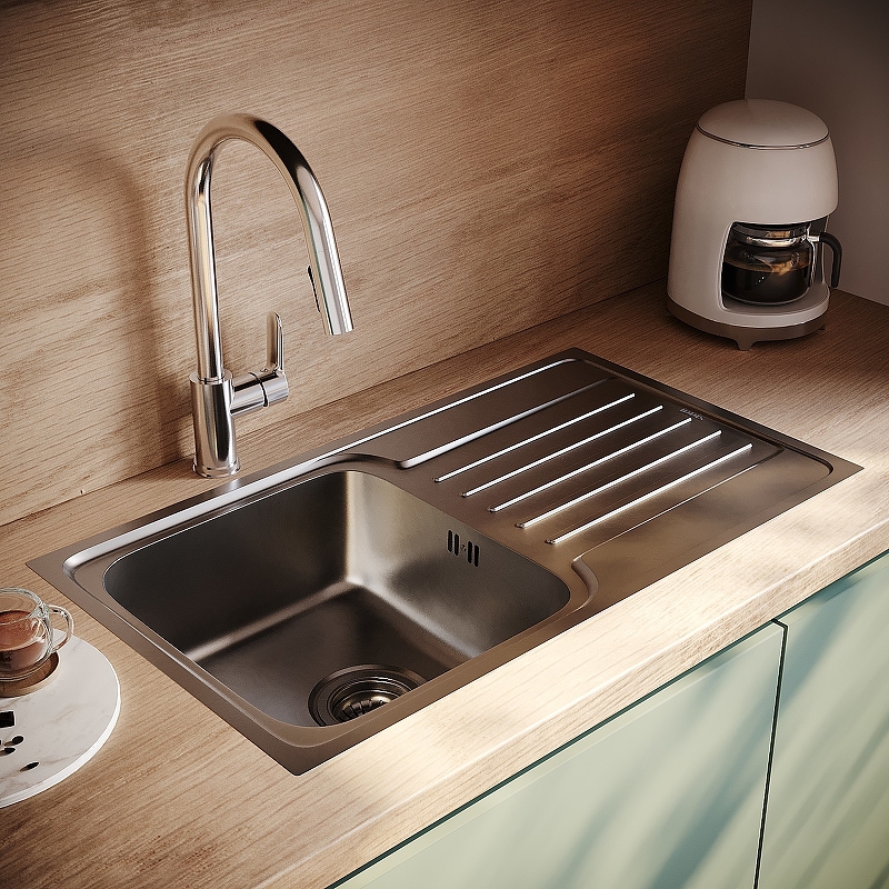 Мойка из нержавеющей стали размером 780*440*180 (мм), прямоугольной формы с крылом, поверхность шёлк с резиновой накладкой и антишумовым покрытием, в комплекте с креплением и уплотнительной лентой.
