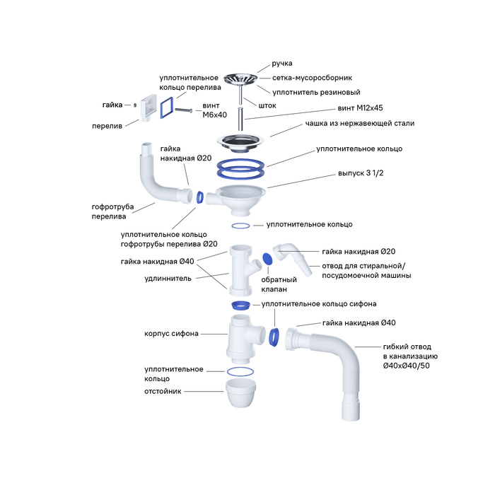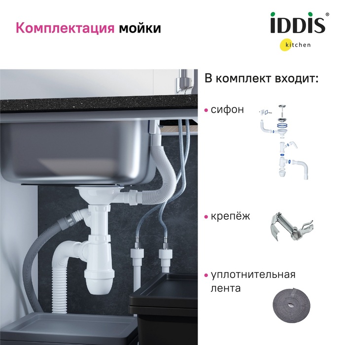 В комплекте: уплотнительная прокладка, крепления, сифон с выпуском