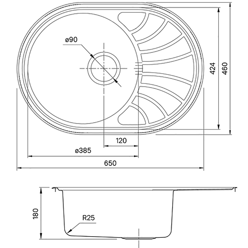 Мойка из нержавеющей стали размером 650*460*180(мм) овальной формы с крылом, поверхность шёлк, с резиновой накладкой и антишумовым покрытием, в комплекте с креплением и уплотнительной лентой.