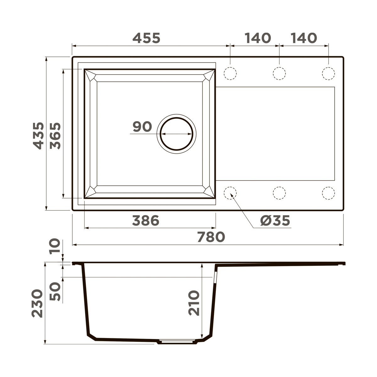 Материал выдерживает высокие температуры до 280°С (но не стоит ставить на поверхность мойки горячие сковородки и кастрюли, т.к их температура может достигать 500°С).