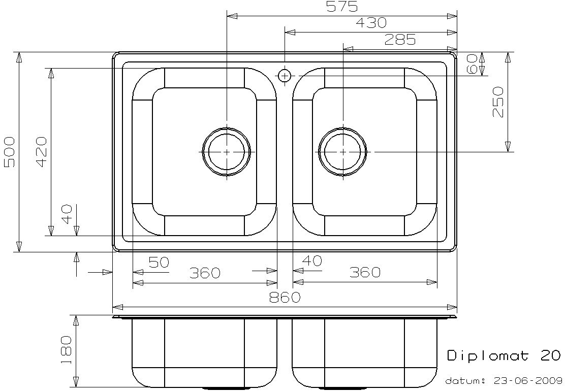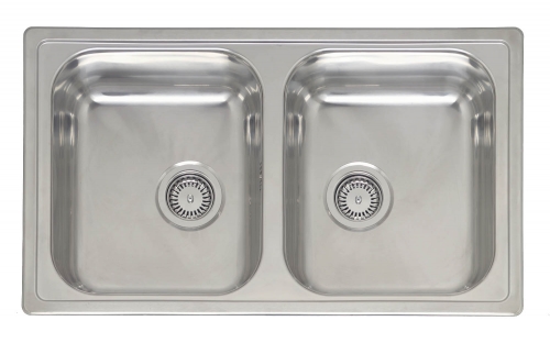 Reginox Diplomat 20 врезная мойка из нержавеющей стали с двумя чашами. Поверхность полированная. Подходит для шкафа шириной 800 мм. Без отверстия под смеситель. Сливное отверстие ? 3,5""(OKG), перелив в чаше."