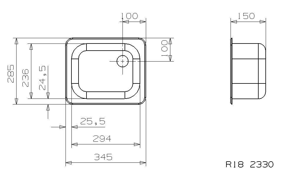Reginox R 18 2330 Lux OSK врезная мойка из нержавеющей стали. Поверхность полированная. Подходит для шкафа шириной 400 мм. Сливное отверстие ? 1,5"" (OSP), перелив в чаше. Без отверстия под смеситель."