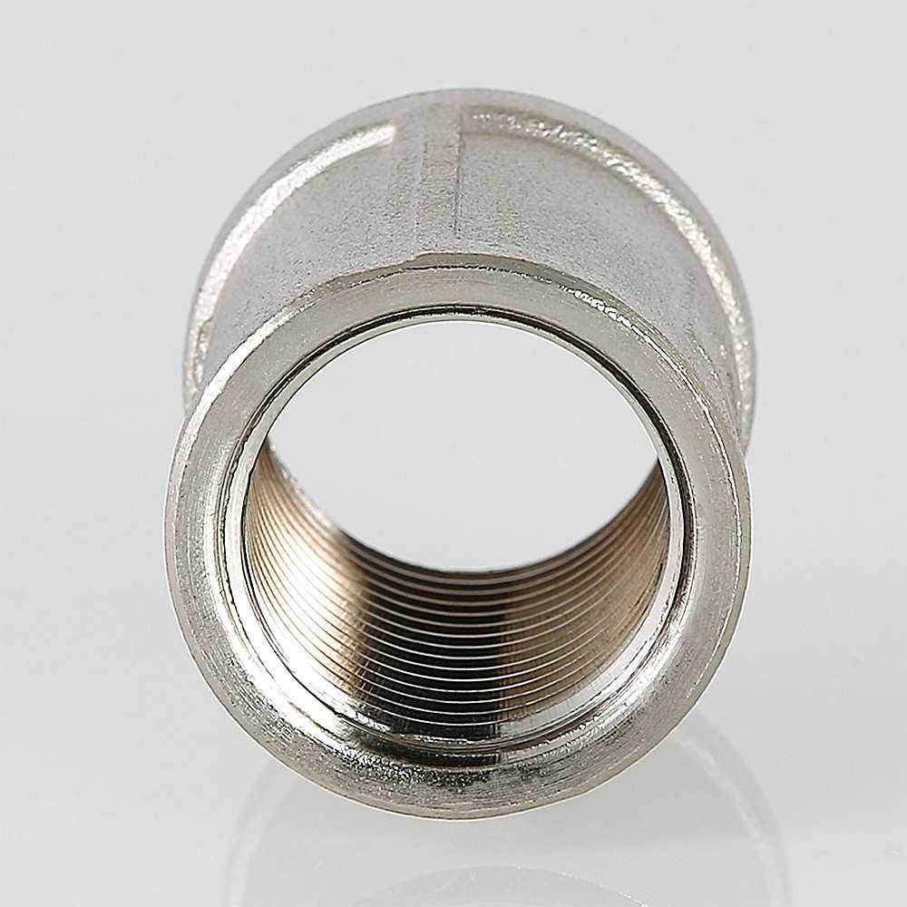 Соединительная муфта с внутренней резьбой. Изготовлена методом объемного горячего объемного прессования из сантехнической латуни марки CW617N (европейский стандарт EN12165) с гальваническим нанесением никелевого покрытия. Цилиндрическая трубная резьба муфты совместима также с наружной конической по ГОСТ 6211 (ISO R7). Максимальное избыточное давление применения фитинга определяется максимальной температурой рабочей среды, типоразмером изделия (условным диаметром до/более 1”): при 120 °С – 40/25, 200 – 30/27, 250 – 27/17 бар.