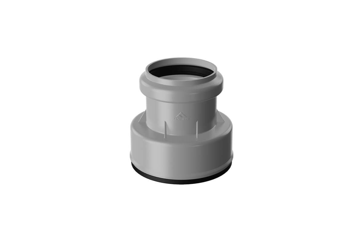 В верхней части корпуса муфта переходная имеет раструб для соединения с пластиковой трубой, а в нижней – эластичную манжету для соединения с чугунной безраструбной трубой. Переходник выполнен высокопрочного полимера, устойчивого к ультрафиолетовому и атмосферному воздействию при температуре от -50 до +90°С.