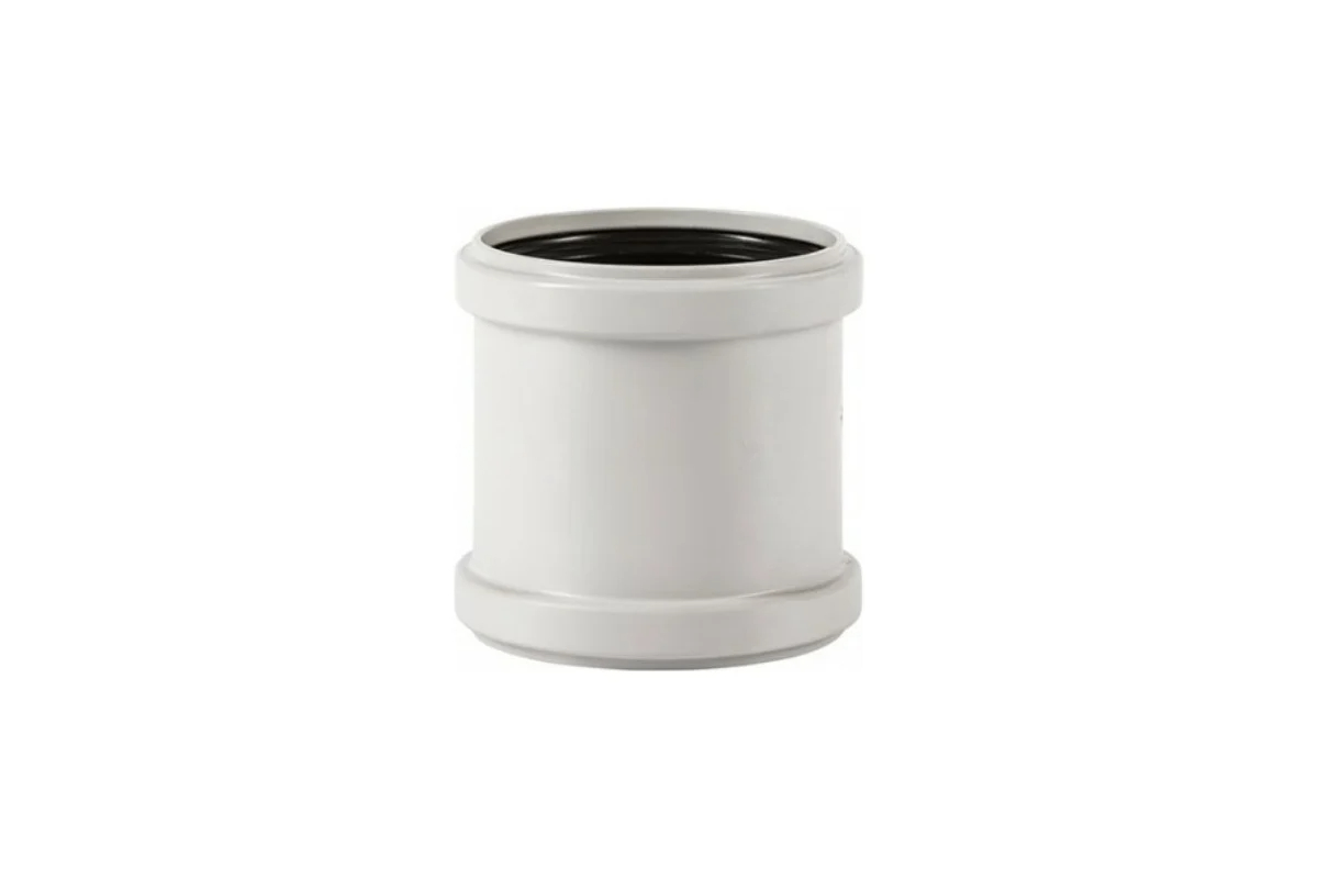 Внутренняя система бесшумной канализации Ostendorf Skolan Safe. Муфта двойная, предназначена для соединения безраструбных частей труб и фитингов, центральный упор внутри муфты обеспечивает соединение равных участков и в случае необходимости облегчает выставление отступа с расчётом на тепловое расширение.