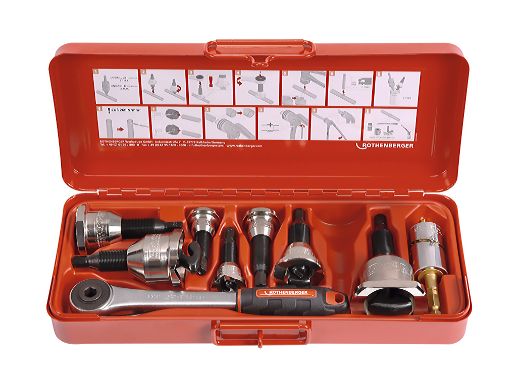 Комплектация: Набор для отбортовки с крюками D 12 - 15 - 18 - 22 - 28 - 35 - 42 мм, специальная трещетка, цанговые клещи, сверло UNIDRILL 42, стальной чемодан.