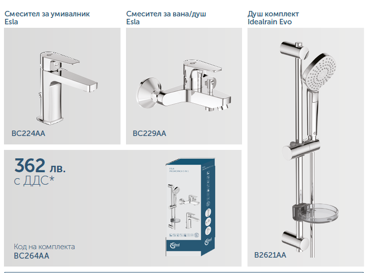 ESLA Промо комплект 3 в 1, состоящий из: BC224AA ESLA Смеситель для умывальника, система монтажа EASY-FIX (облегченный монтаж), аэратор Perlator с ограничением потока 5 л/мин., керамический картридж 35 мм с функцией HWTC, металлическая рукоятка с индикаторами горячей / холодной воды, гибкая подводка G3/8, пластиковый донный клапан, BC229AA ESLA Настенный смеситель для ванны/душа, монтаж на стандартных эксцентриках (в комплекте: эксцентрики, металлические отражатели, уплотнительные прокладки), аэратор Perlator, керамический картридж 35 мм с функцией HWTC, металлическая рукоятка с индикаторами горячей / холодной воды, автоматическое переключение ванна/душ, обратный клапан, B2621AA IDEALRAIN EVO DIAMOND L3 Душевой гарнитур со штангой 60 см, 3-функциональная лейка ?110 мм, ограничитель потока воды 8 л/мин, шланг 1750 мм с силиконовым покрытием IDEALFLEX, пластиковый держатель, мыльница в комплекте. Каждое изделие упаковано индивидуально, все три изделия упакованы в одну промо-коробку 750X285X160.