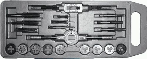 - 9 метчиков и 9 плашек: M3x0.5, M4x0.7, M5x0.8, M6x1.0, M7x1.0, M8x1.25, M10x1.5, M12x1.75, 1/8NPT, метчикодержатель, - плашкодержатель, - пластиковый кейс.