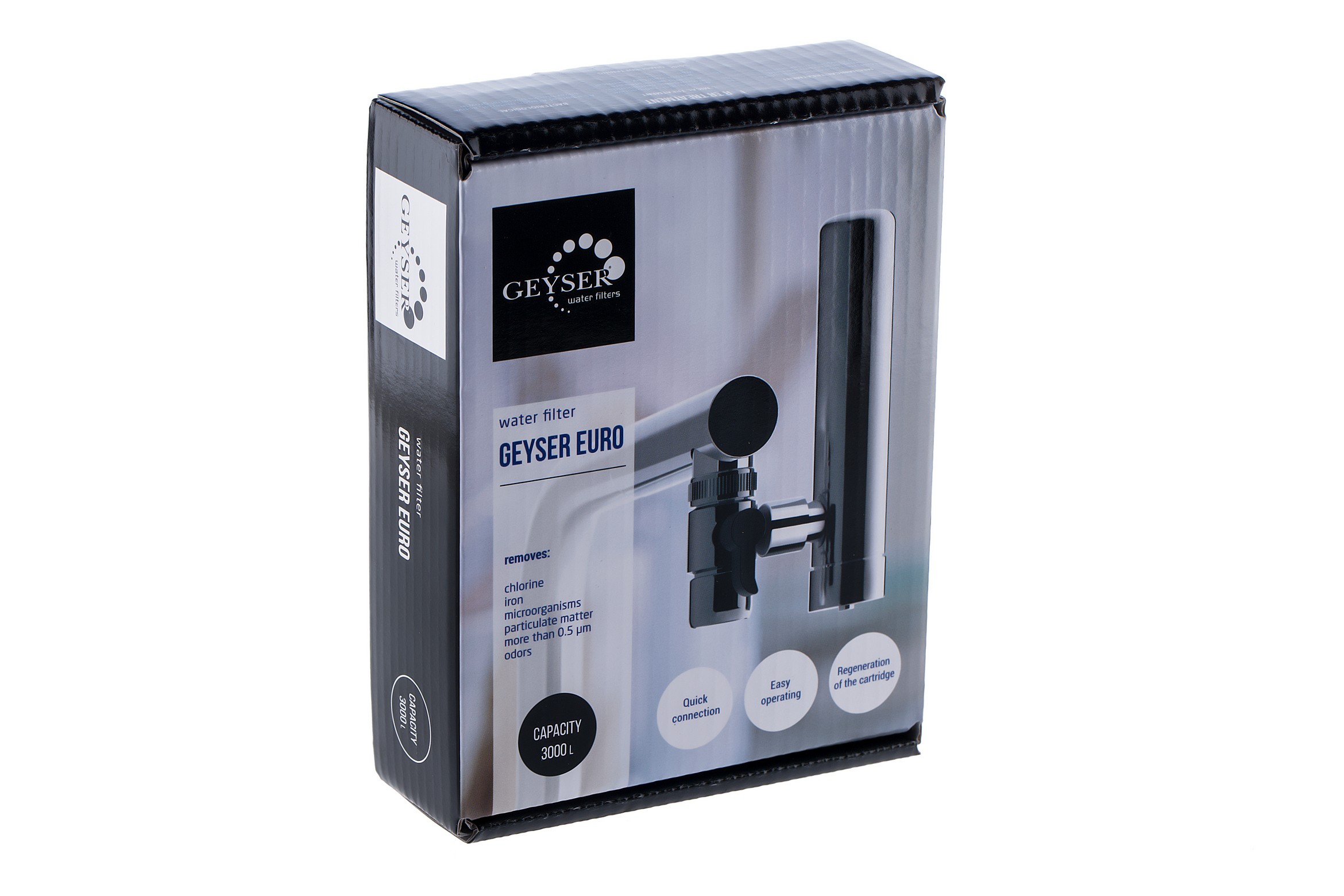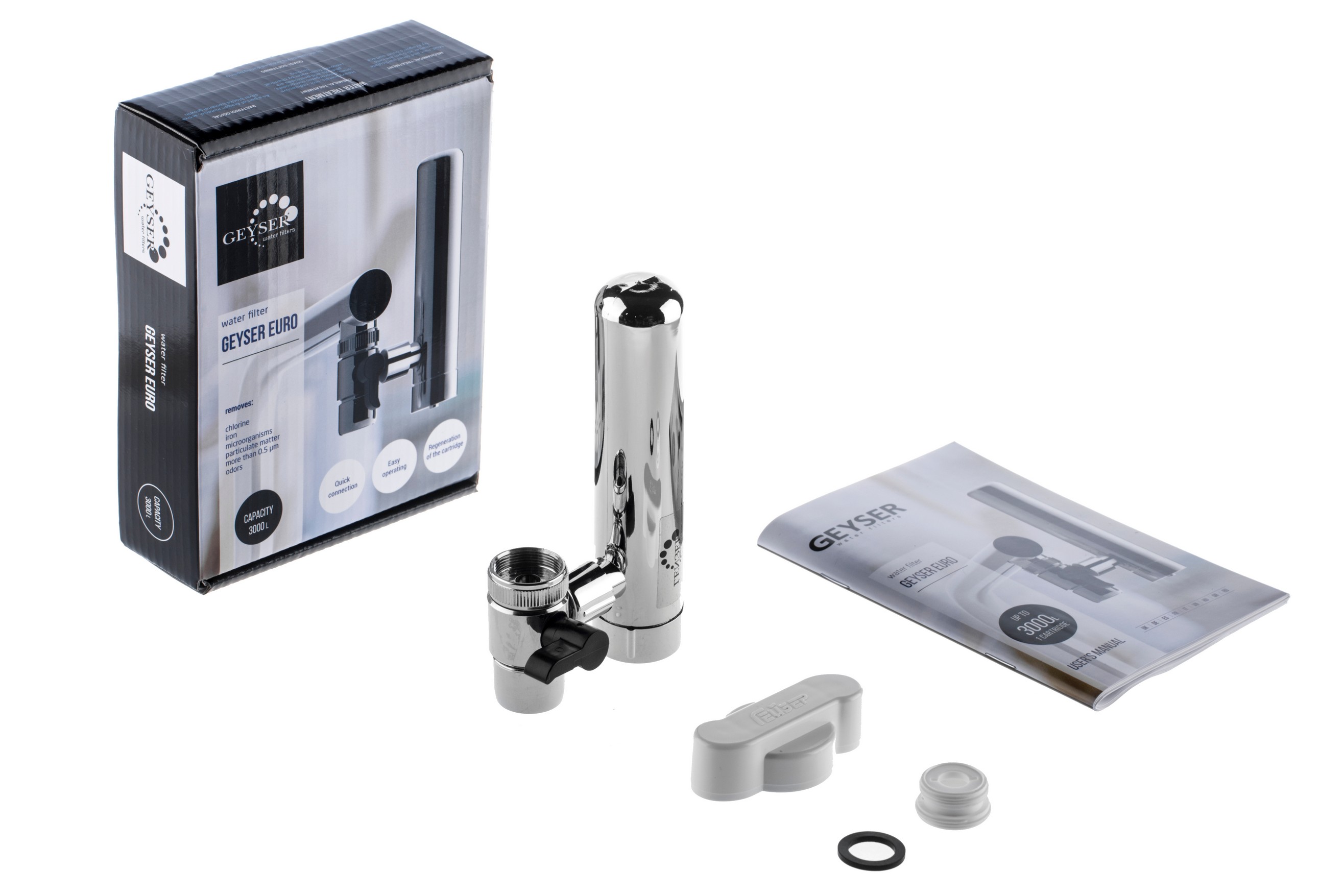 Фильтр Гейзер-Евро используется для кранов с аэратором. Переключение потока воды осуществляется дивертором (на фильтрацию или в мойку).