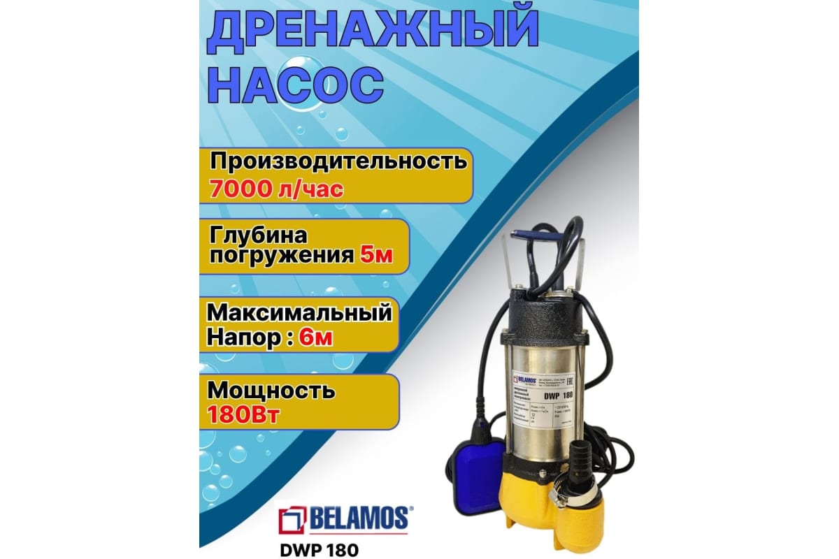 Погружной дренажный насос Belamos DWP180 предназначен для отведения грязной жидкости, содержащей большое количество примесей и мусора из сточных канав, бассейнов, канализационных систем, погребов, резервуаров и т.д. Допускается содержание в жидкости длинноволокнистых включений и частиц размером до 15 мм. Насос способен перекачивать до 6500 литров в час. Защита IPx8 способствует продолжительной работе насоса на большой глубине.