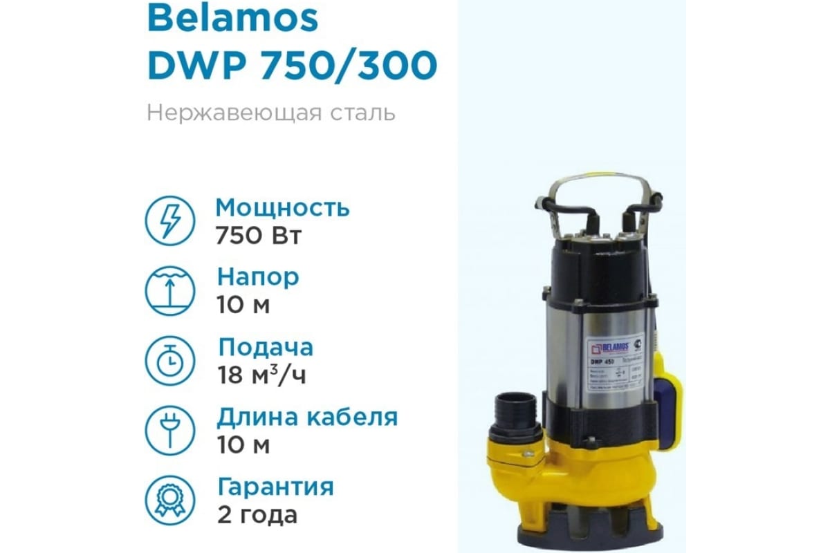 Погружной дренажный насос БЕЛАМОС DWP 750 используется в быту для перекачивания грязной воды. Размер частиц не должен превышать 25 мм. Насос оборудован поплавковым выключателем для защиты от "сухого хода". Электродвигатель имеет теплозащиту. Корпус из нержавеющей стали не подвержен коррозии, что гарантирует долговечность. Пропускная способность агрегата - 300 л/мин.