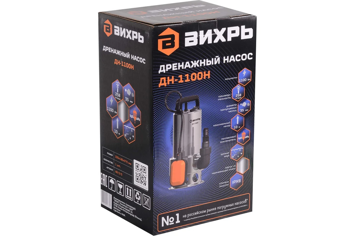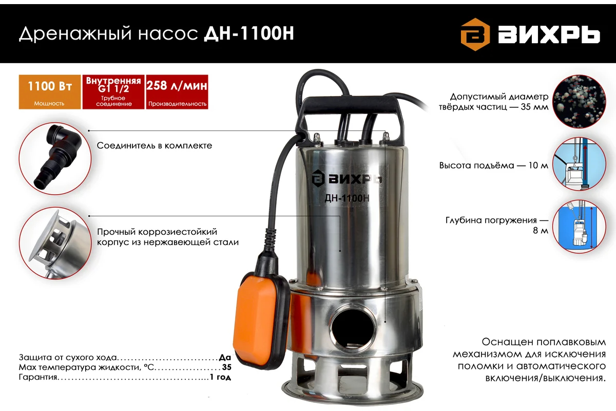 Дренажный насос Вихрь ДН-1100Н используется для откачки загрязнённой воды из подвалов, емкостей, водоёмов. Диаметр твердых примесей не должен превышать 35 мм.