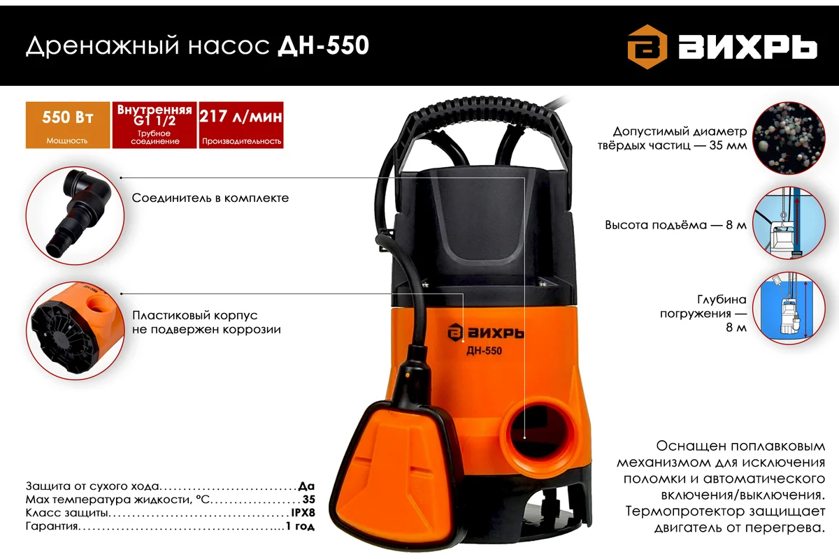 Дренажный насос Вихрь ДН-550 может эксплуатироваться для перекачки воды из затопленных котлованов, подвалов и других помещений, емкостей и резервуаров. Вода может быть поднята на высоту до 8 метров, что расширяет возможности его использования в сложных условиях. Насос способен пропускать твёрдые частицы диаметром до 35 мм, что делает его подходящим для работы с грязной водой.