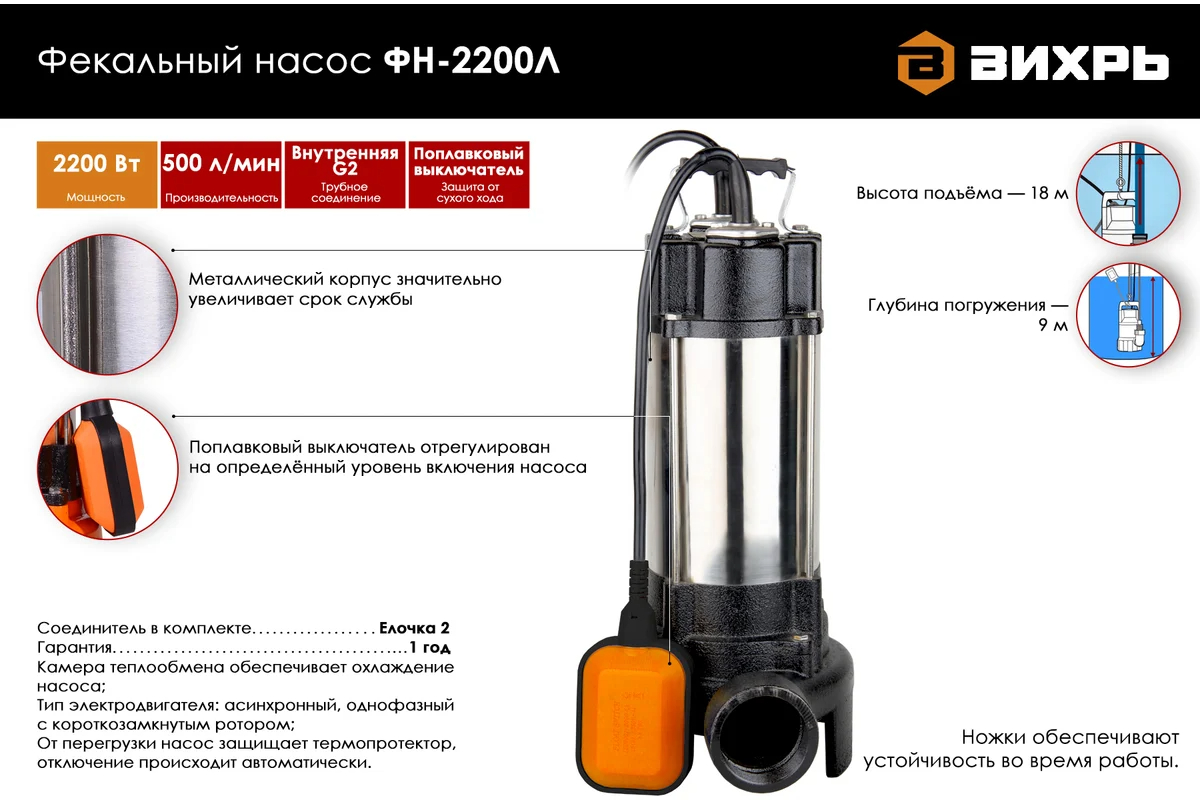 Насос Вихрь ФН-2200Л оснащен мощным электродвигателем на 2200 Вт, обеспечивающим высокую производительность – до 500 литров в минуту. Это позволяет оперативно справляться с большими объемами сточной воды, что делает его отличным решением для применения в сложных условиях.