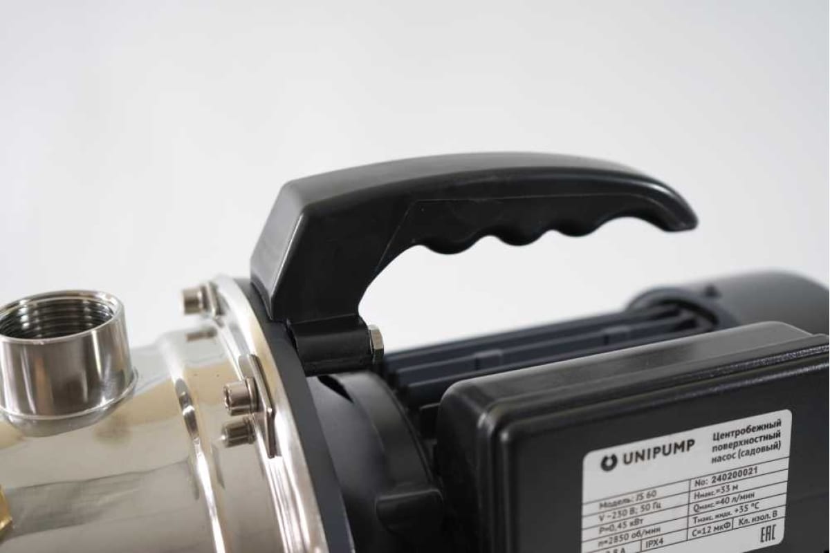 Поверхностный насос UNIPUMP JS 60 садовый - однофазный одноступенчатый центробежный поверхностный насос с укороченным эжектором, корпусом из нержавеющей стали, рабочим колесом из латуни, медной обмоткой статора. Поверхностный насос JS 60 предназначен для подачи чистой холодной воды из скважин и колодцев (глубиной не более 8 метров), открытых водоемов, резервуаров и других источников водоснабжения.
