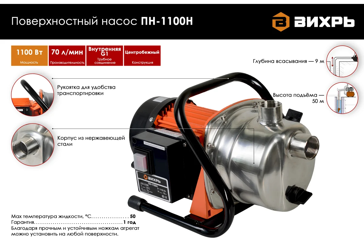 Поверхностный насос Вихрь ПН-1100Н — это мощное и высокопроизводительное оборудование, предназначенное для перекачки воды в различных бытовых и промышленных целях. Этот насос обладает центробежным типом конструкции, что обеспечивает эффективность в перекачивании большого объема жидкости